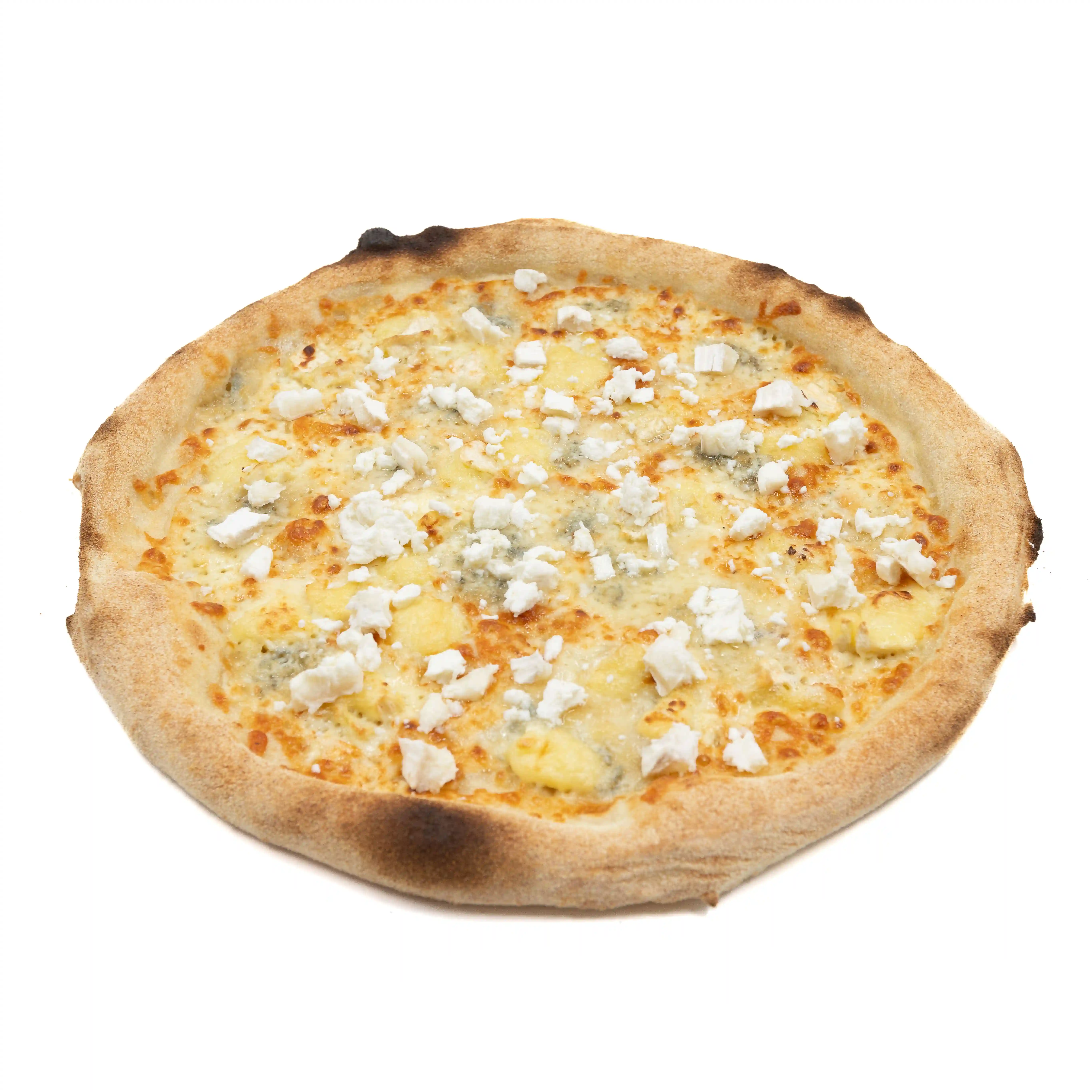 Crème fraîche, Mozzarella, Jambon blanc, Gorgonzola, Tallegio, Oregan, Huile d’olive.