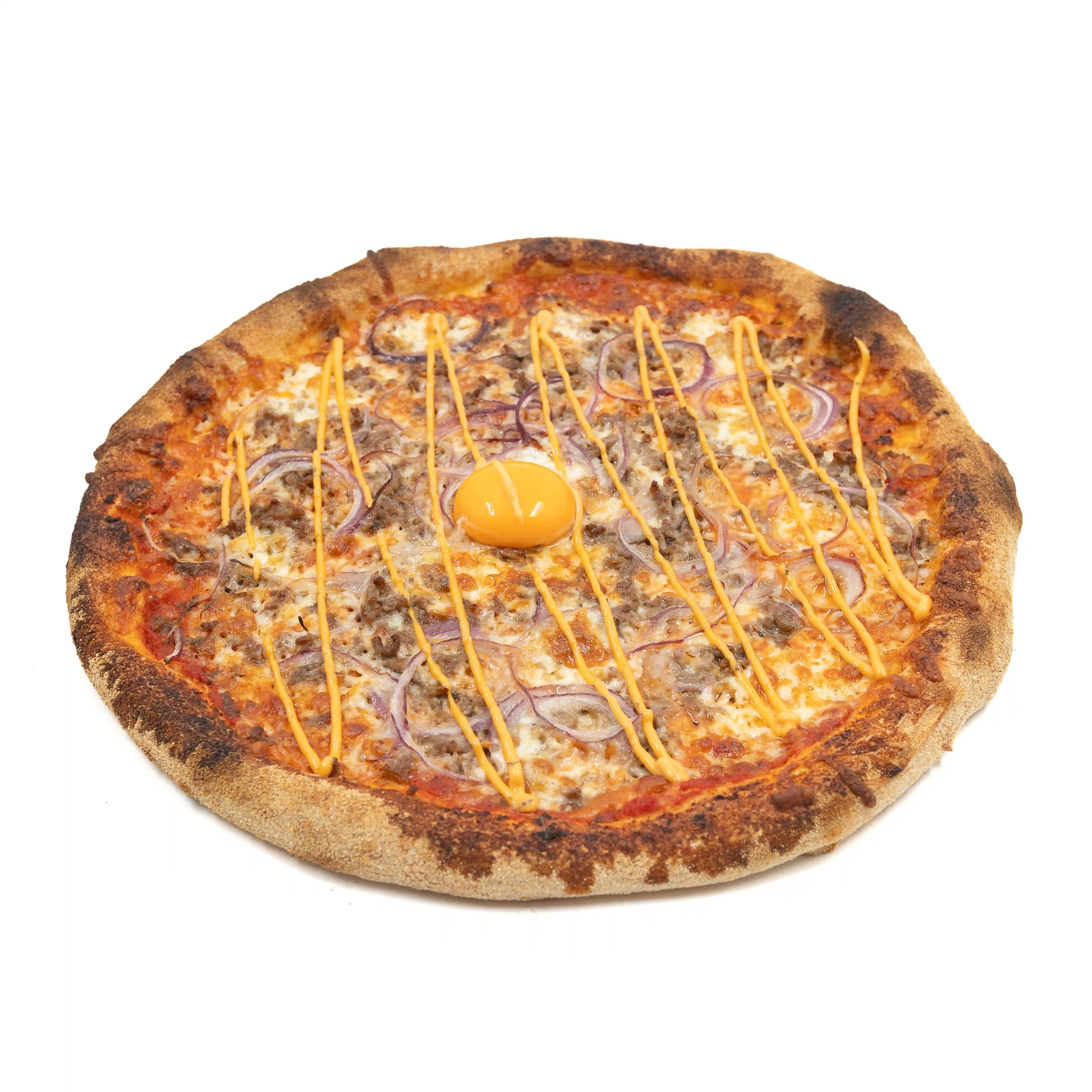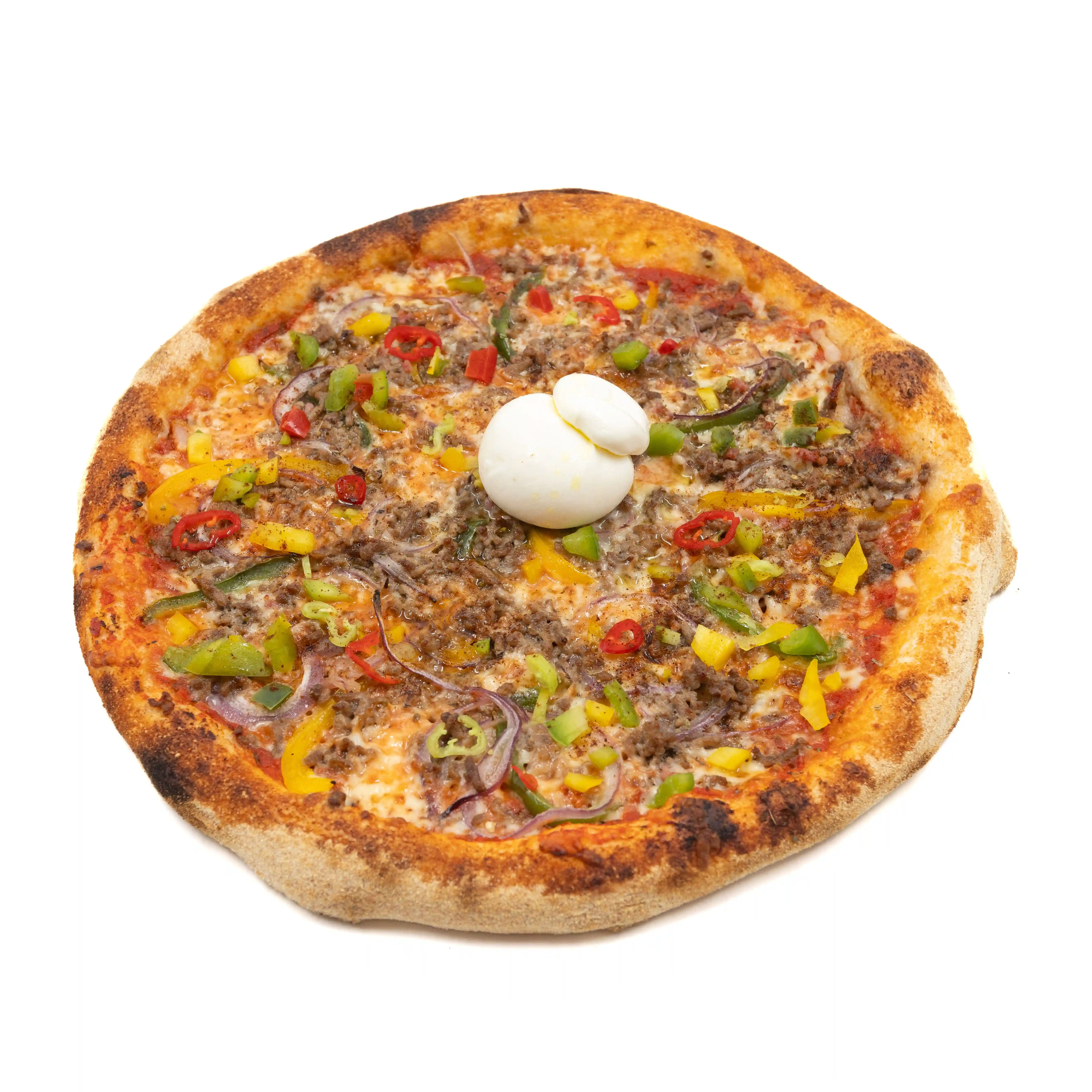 Sauce tomate, Mozzarella, Bœuf haché, Poivrons, Oignons, Piments, Origan,