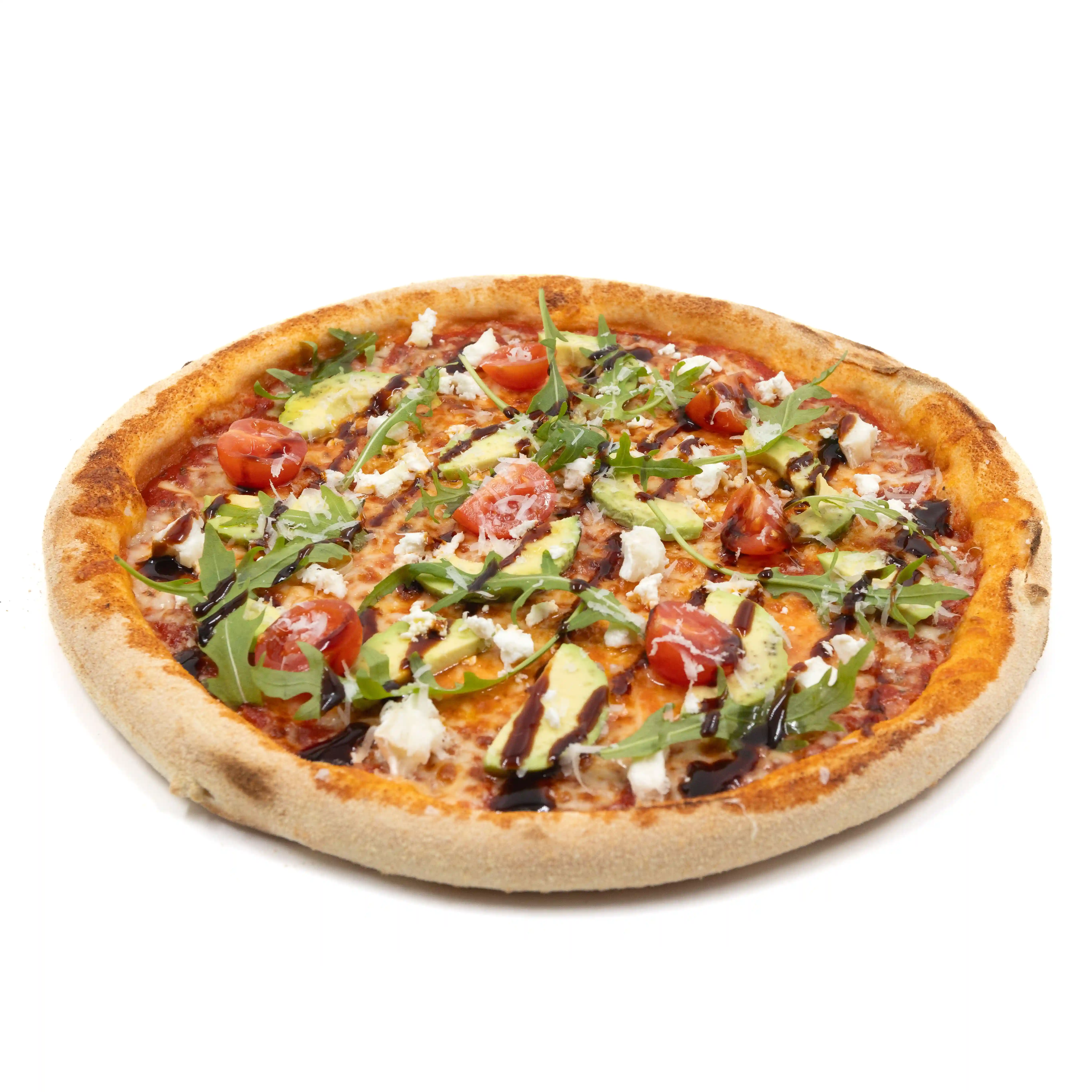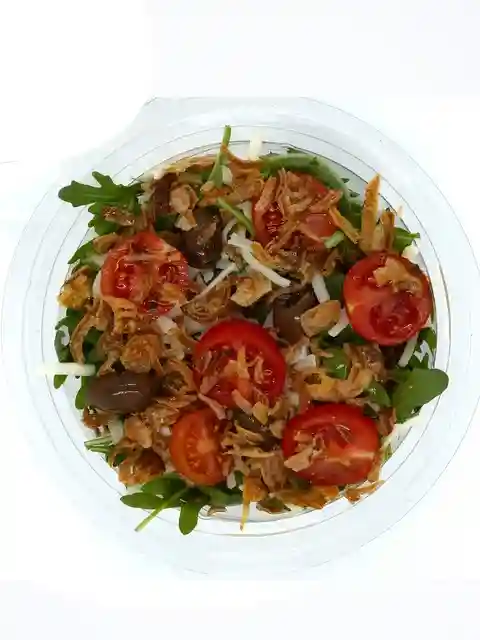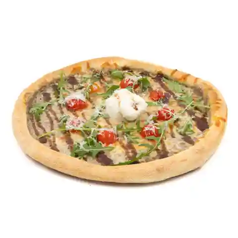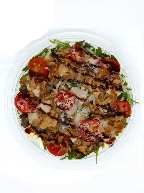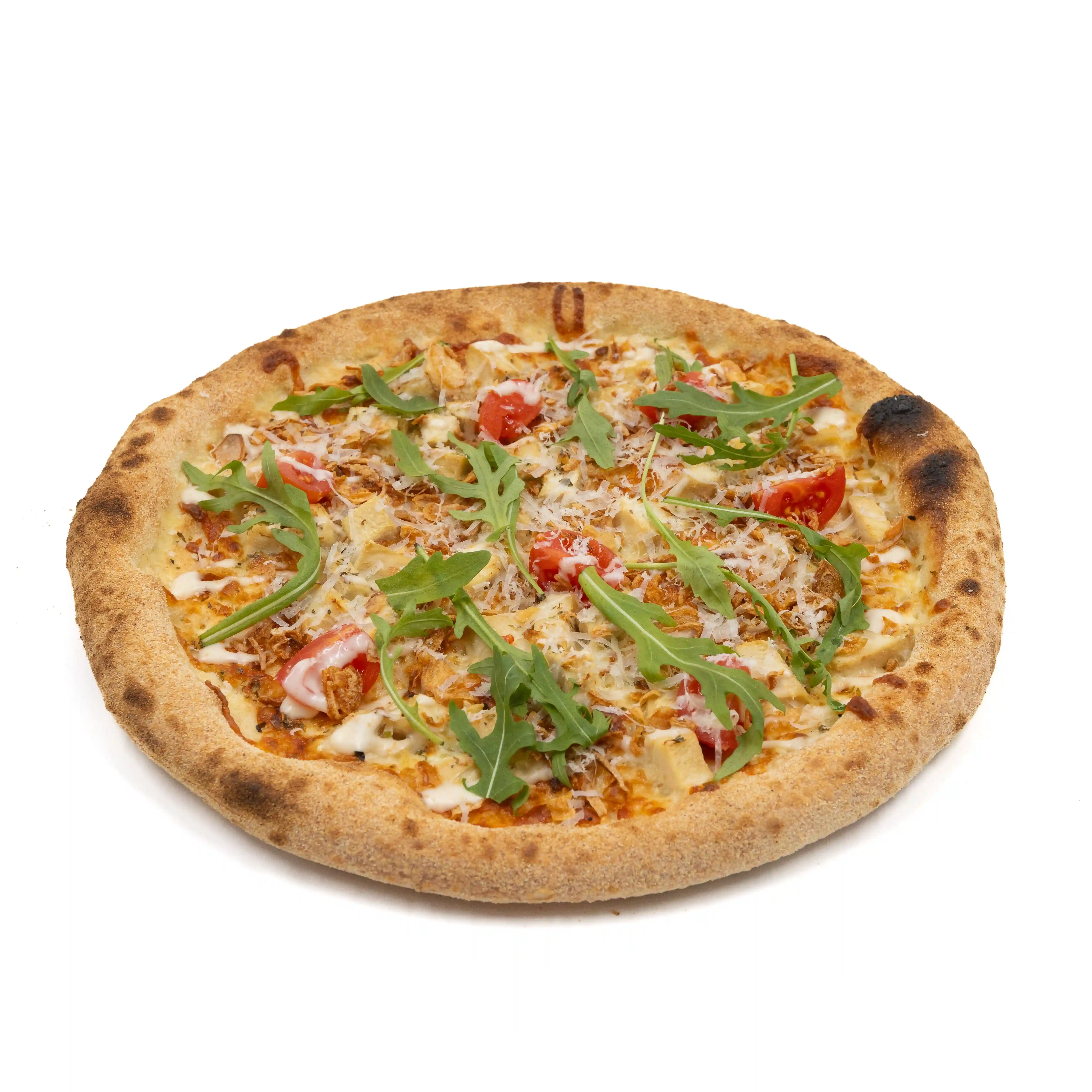 Roquette, Poulet, Mozzarella, Oignons frits, Tomates cerises, Olives, Parmesan, Huile d'olive, Crème balsamique.