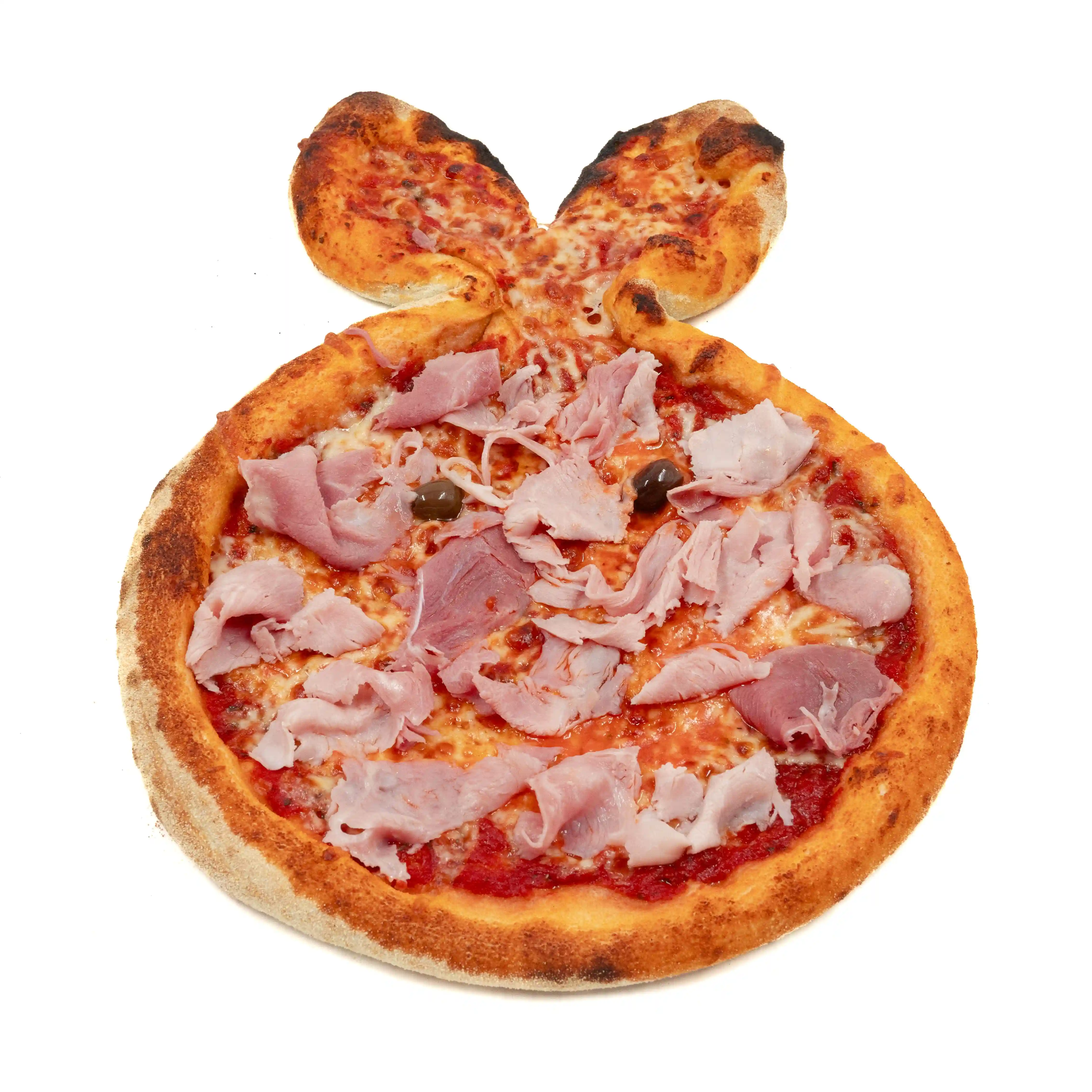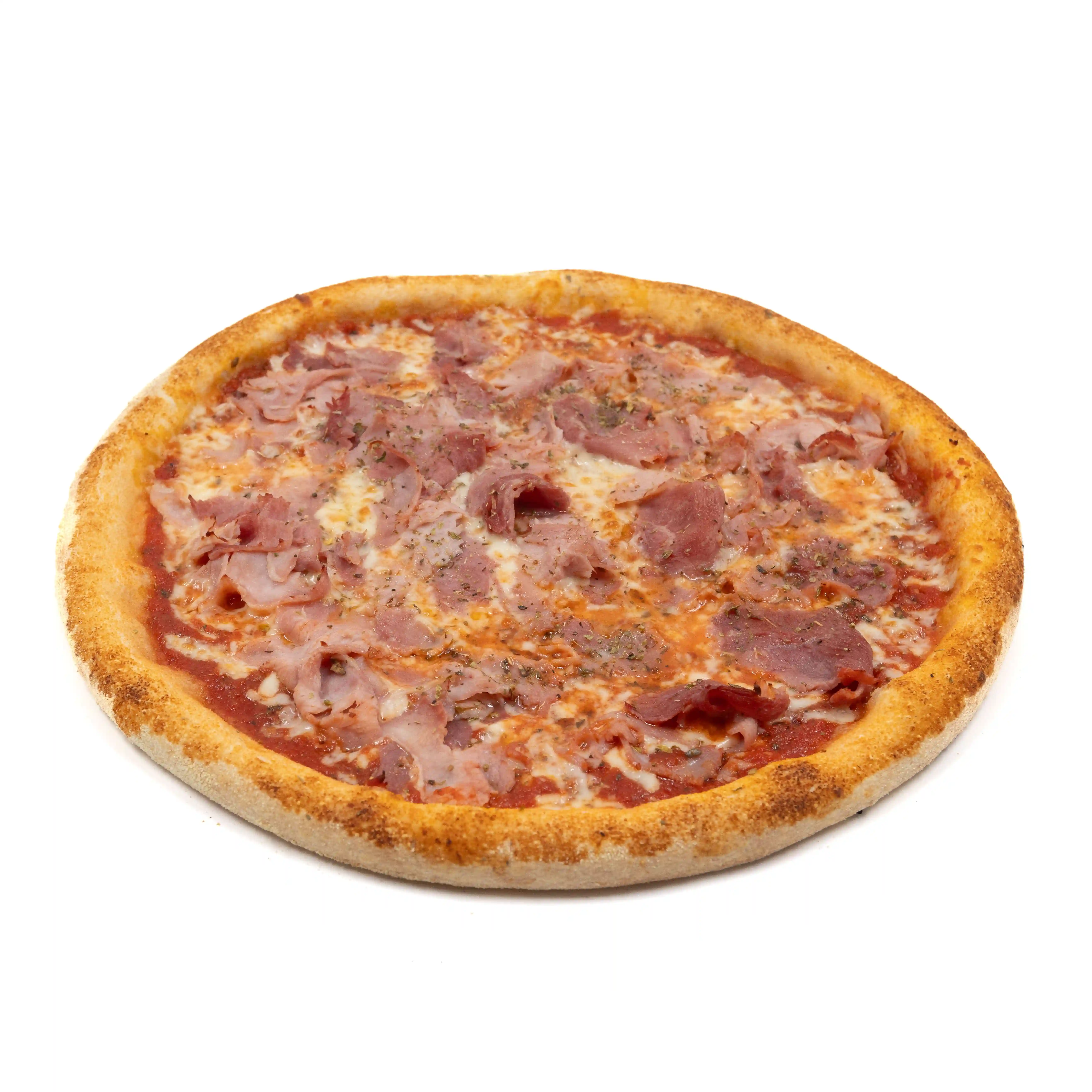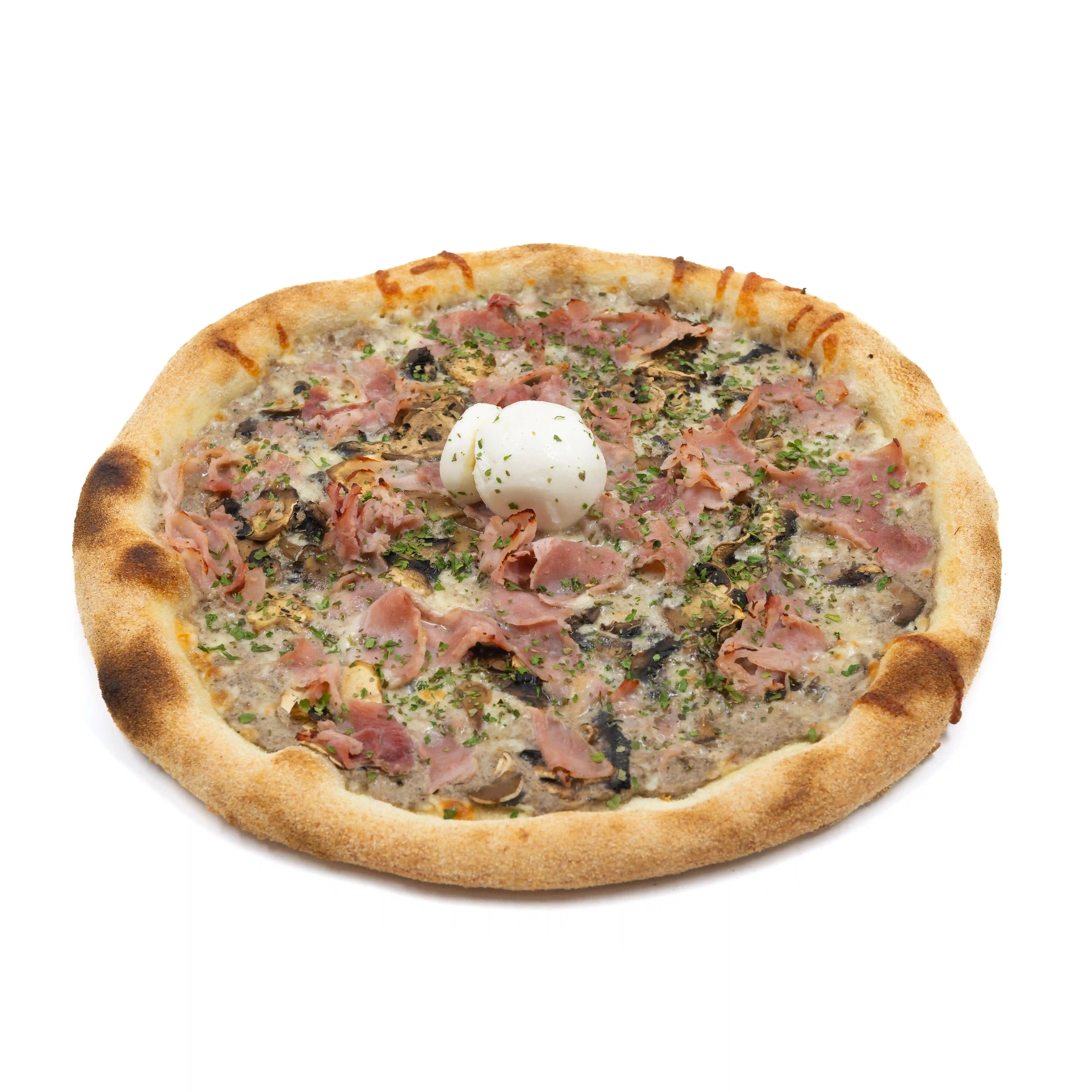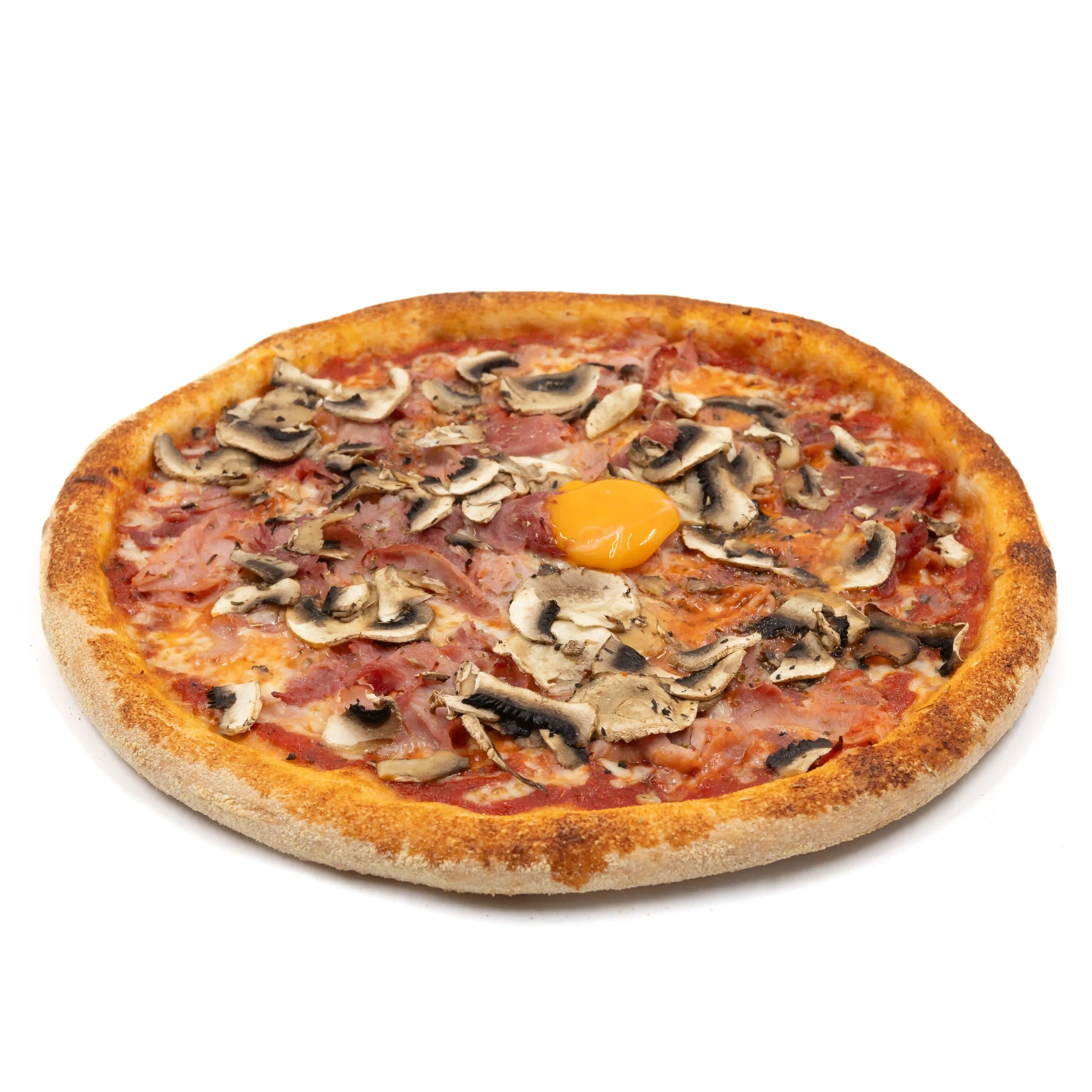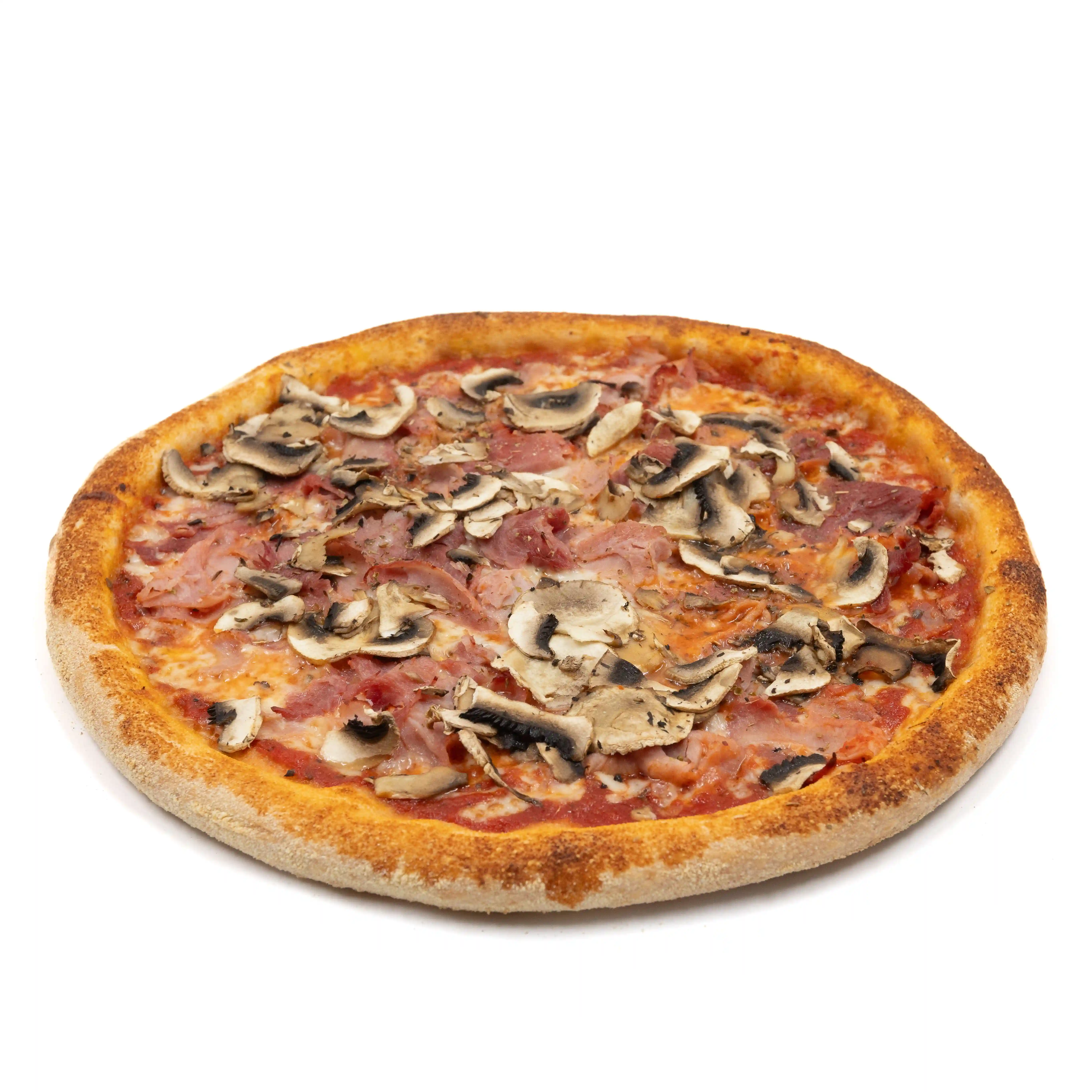 Sauce tomate, Mozzarella, Jambon blanc, Champignons frais, Huile d'olive extra vierge, Origan.