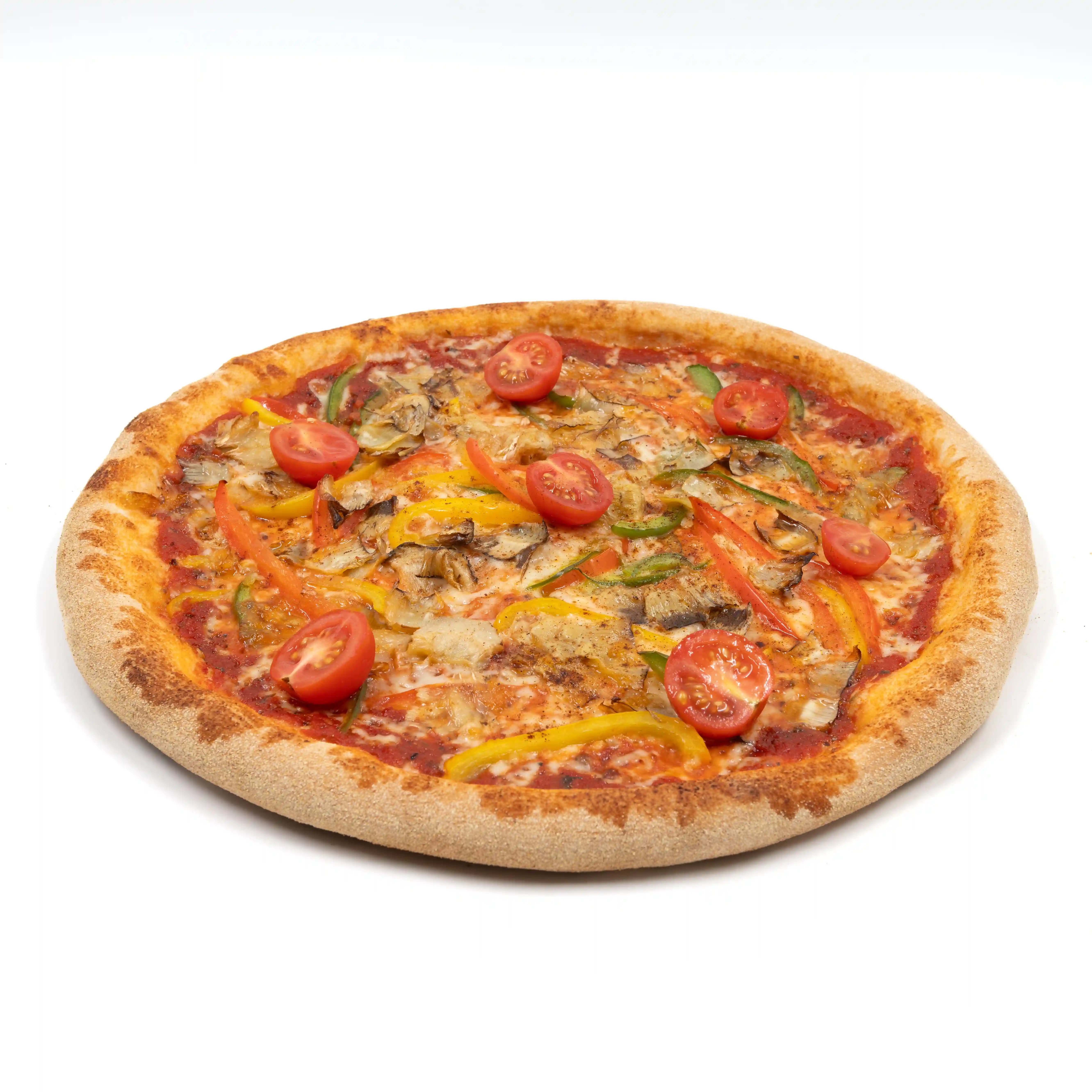 Sauce tomate, Mozzarella, Poivrons, Artichaut, Piment, Huile d’Olive.