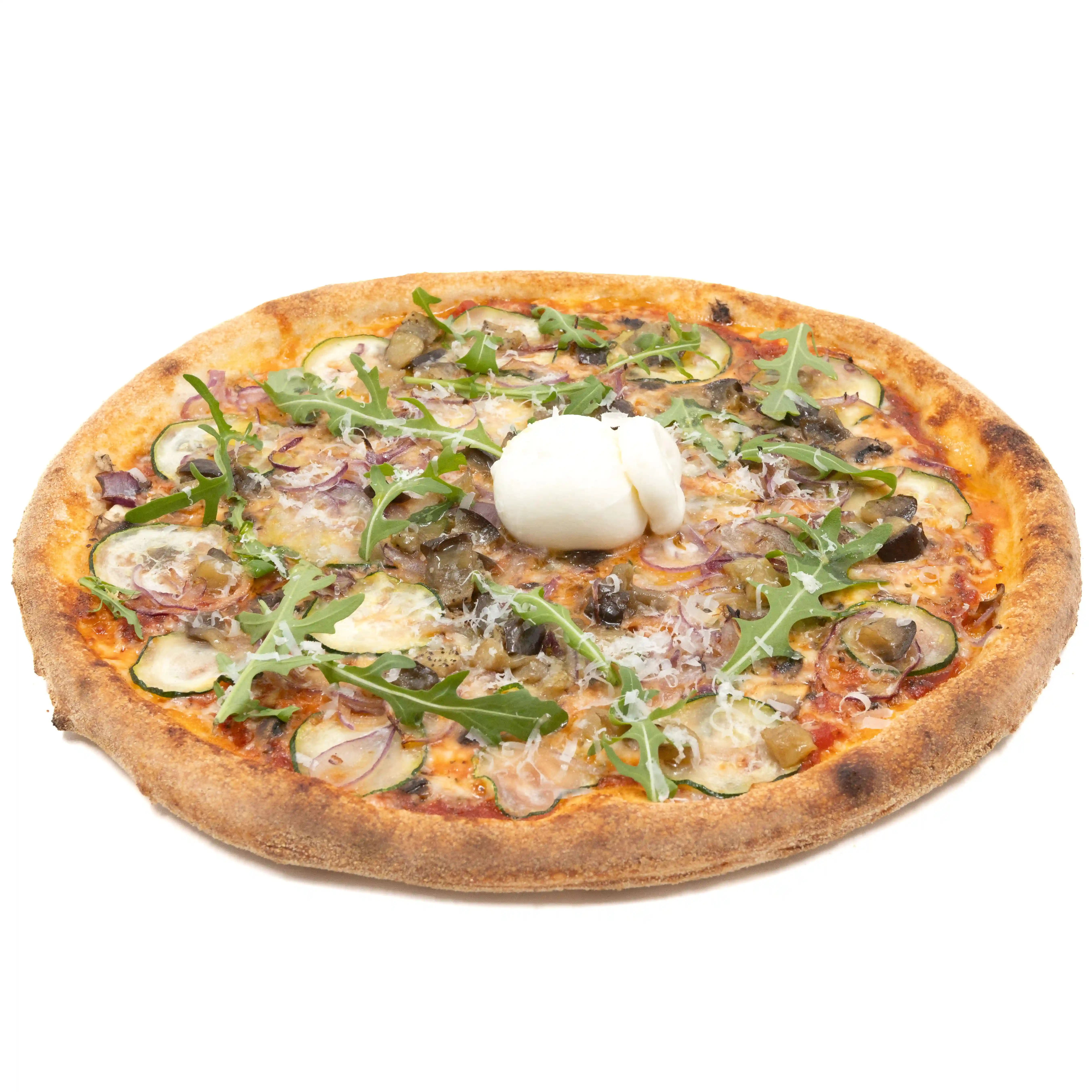 Sauce tomate, Aubergines, Courgettes, Champignons frais, Mozzarella, Oignons.