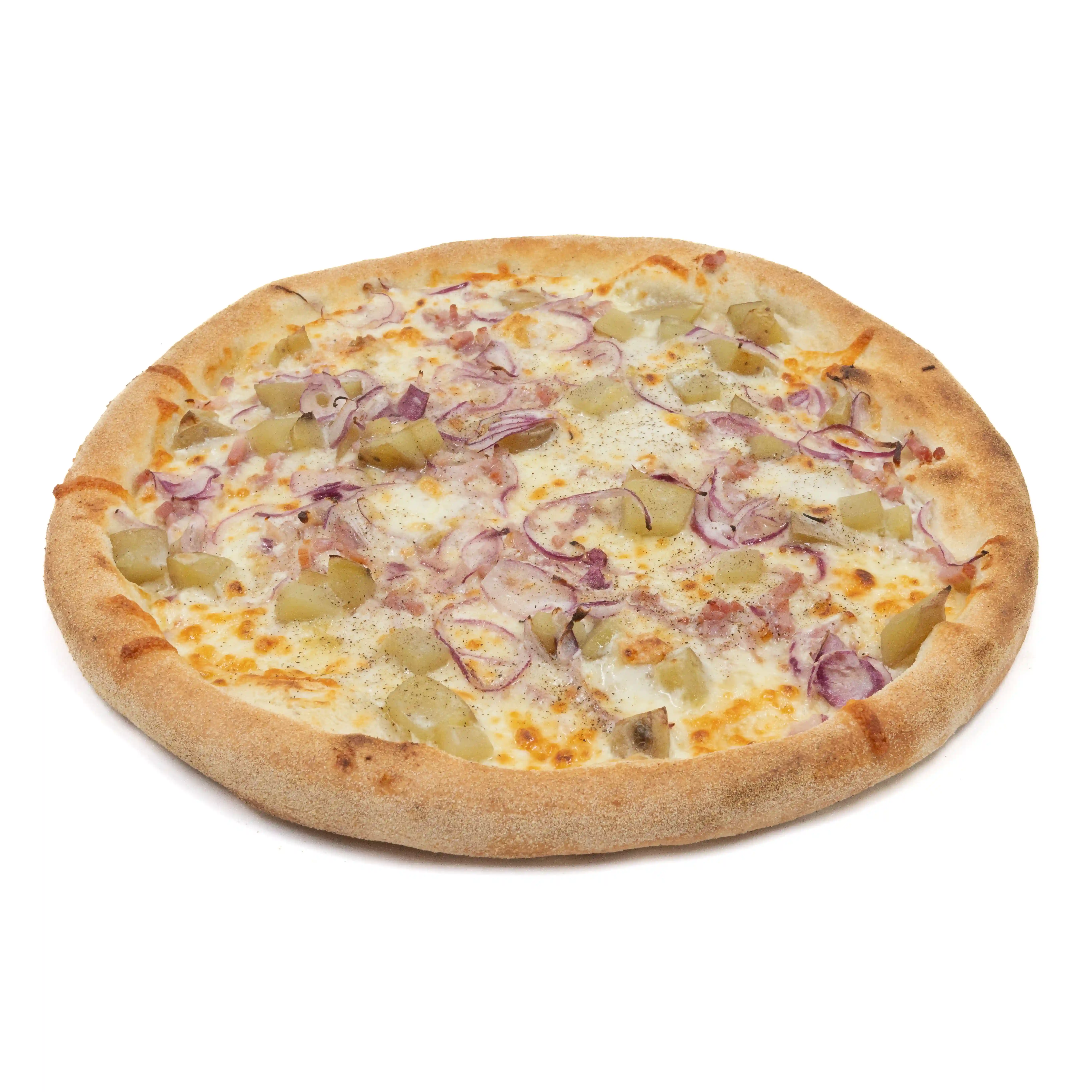 Base Mozzarella, Crème fraîche, Demi-saucisse de Montbéliard, Taleggio, Oignons.