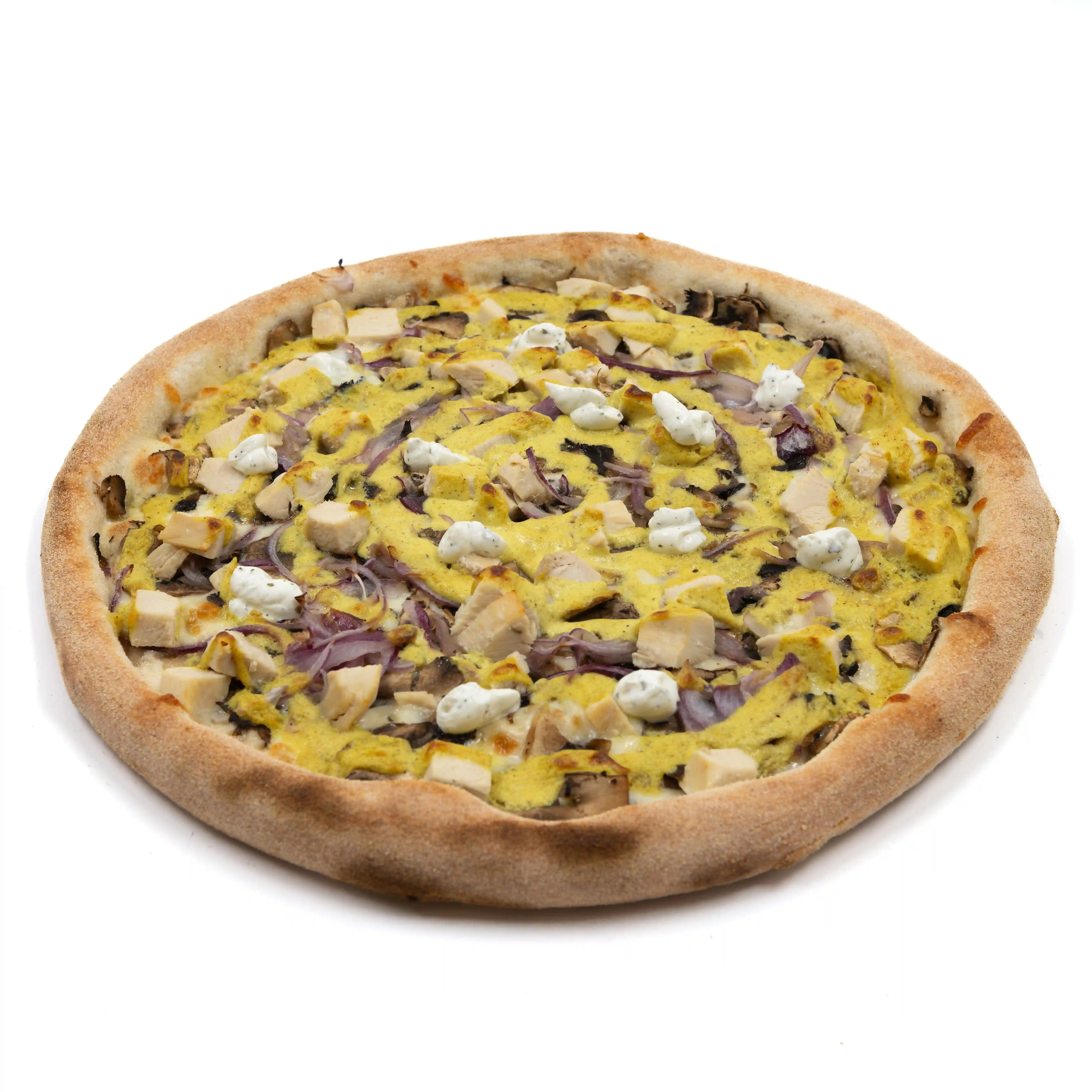 Crème de curry, Mozzarella, Poulet, Oignons, Champignons frais.
