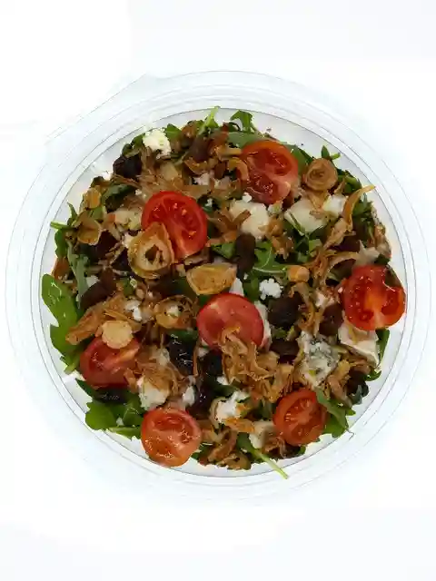 Roquette, Fromage de chèvre, Gorgonzola, Oignons frits, Tomates cerises, Raisins secs, Huile de basilic.