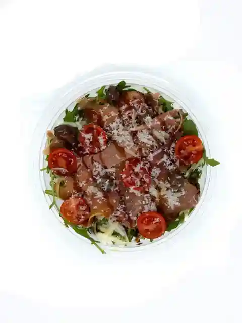 Roquette, Mozzarella, Jambon cru, Tomates cerises, Olives, Parmesan, Huile d'olive, Crème balsamique à la truffe.