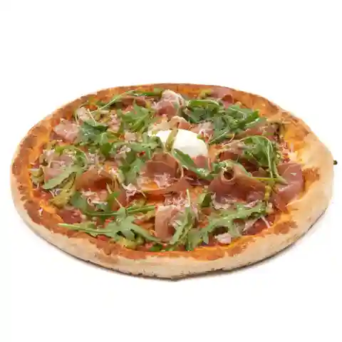 Après cuisson : Burrata, Jambon cru, Parmesan, Huile d'olive, Pesto, Roquette.